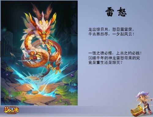 《梦幻西游》新Boss神龙雷怒,乃轩辕黄帝麾下司雨大龙神,龙如其名,性格刚烈,好勇擅斗,曾因闯祸被罚禁绝香火,后机缘巧合与蚩尤相遇,并受蚩尤相助度过刑罚难关。因此我们的神龙雷怒许下诺言,他日若蚩尤有事相求,必当鼎力相助……后来蚩尤败于黄帝而被封印,妄图发动武神坛之乱,又被《梦幻西游》三界精英破坏计划,而且每个月都要被武神坛精英围殴一次。不堪凌辱的蚩尤想到了一诺千金的神龙雷怒,因此困兽犹斗,请神龙拔掉武神坛神木,破除武神坛封印,助蚩尤摆脱困境。重信守诺的神龙,即将再度降临三界,不过此次却危及苍生,玩家们当然不能坐视不理,可神龙的强大实力也是众人皆知,一个屏幕都还容不下它的全身,从目前官方给出的游戏图片推测,坐拥风云的它能横跨四到六个屏幕!
